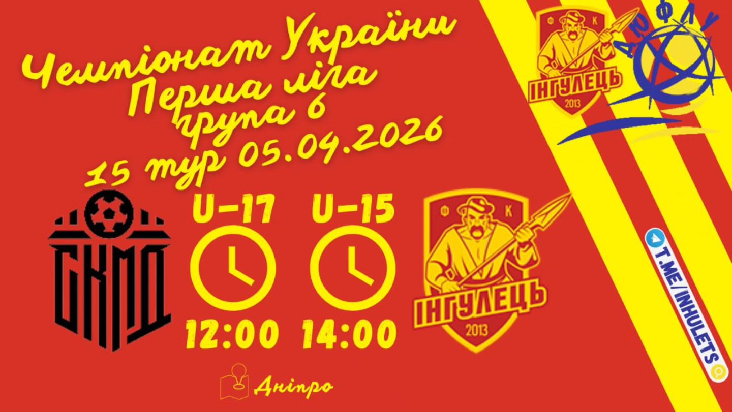 Поки основа готується до свого бою, наші юні козаки вирушають на відповідальний виїзд! У рамках 15-го туру ДЮФЛУ (Перша ліга, Група 6) команди «Інгульця» U-17 та U-15 зійдуться у протистоянні з дніпровським «СКМД». Наші хлопці налаштовані лише на перемогу та готові демонструвати характер на кожному клаптику поля! 💪⚽️Підтримаємо наше майбутнє! Ваші лайки та коментарі — це додаткова мотивація для хлопців викладатися на всі 100%.